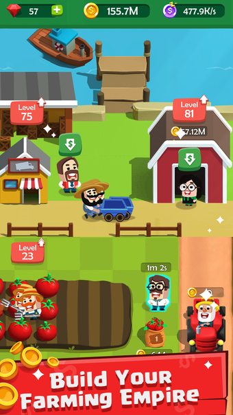 استأجر مدراء للإشراف على عملك واتخاذ قرارات أكبر مع تقدمك. حتى عندما تكون غير متصل بالإنترنت، سيقوم عمالك السعداء بتوليد النقود لك. اصنع استثمارات ذكية وادارة عدة مزارع بينما تنمو إمبراطوريتك، وتحصد مجموعة متنوعة من المحاصيل مثل الذرة وزهور الشمس والتوت الأزرق وغيرها.